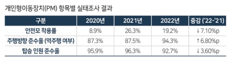 개인형 이동장치(PM)의 ▲안전모 착용 ▲동반 탑승 ▲역주행 여부 등 법규 준수 현황을 집계한 공단의 조사 결과 여전히 안전 사각지대에 있는 것으로 나타났다.