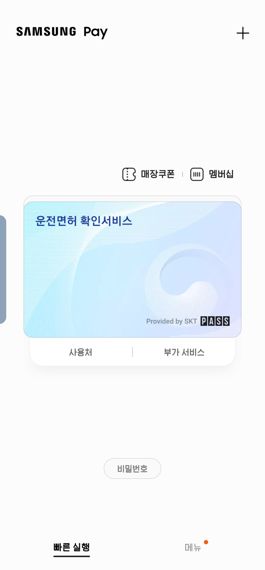 삼성전자가 국내 이동통신 3사(SK텔레콤·KT·LG유플러스)와 협력해 모바일 운전면허 확인서비스를 7일부터 삼성페이에서 지원한다고 밝혔다. 모바일 운전면허 확인서비스는 운전면허증을 삼성페이에 등록해 실물 운전면허증 없이도 운전 자격이나 성인 여부 등을 간편하게 증명할 수 있는 서비스이다
