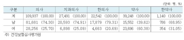 남성 한의사 10명중 8명..여약사 60% 상대적 우위