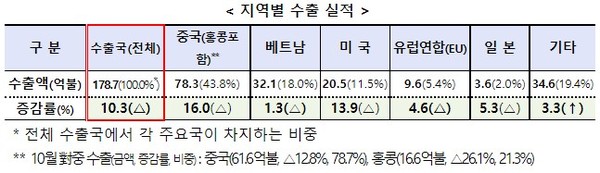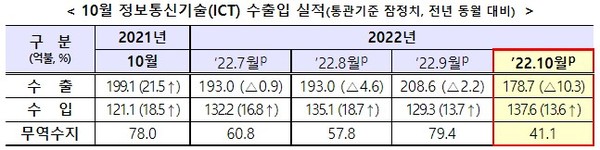 지난달 정보통신기술(ICT) 수출액은 줄고 수입은 거꾸로 늘면서 ICT 무역수지가 반토막으로 줄었다. 14일 산업통상자원부에 따르면 10월 ICT 수출은 178.7억불로 전년동기 대비 10.3% 감소했다.