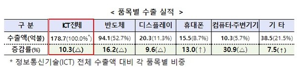글로벌 경기 여건 악화로 반도체, 디스플레이, 컴퓨터와 주변기기 수출이 모두 줄었다. 휴대폰은 고부가가치 상품 위주로만 증가했다. 전방산업 수요 위축과 IT 기기 생산 축소 등으로 주요 지역인 홍콩을 포함한 중국과 베트남, 미국, EU, 일본향 수출이 일제히 줄었다.