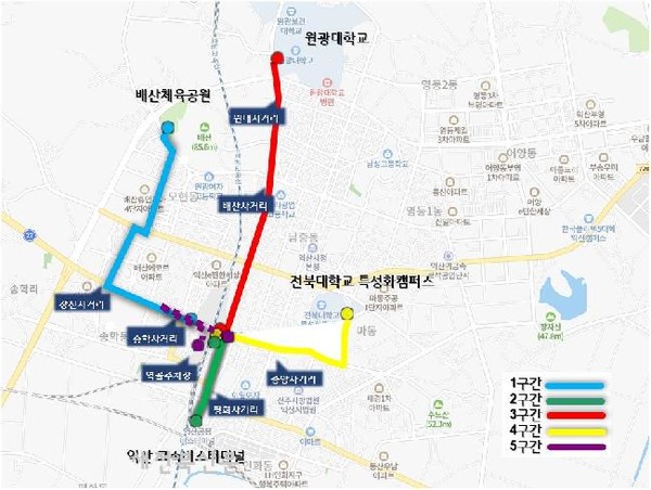 지정된 자율주행 자동차 시범운행 지구는 총 5개 노선(10.7km)이다. 1구간은 익산역 서부광장~배산체육공원 2.9km, 2구간 익산역 환승장~익산고속버스터미널 1.6km, 3구간 익산역 환승장~원광대학교․병원 3.2km, 4구간 익산역 환승장~전북대학교 2.2km, 회차 노선인 5구간은 익산역 동부광장~역골 주차장 1.6km 구간 등이다.