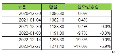 실제 외환시장에서 원·달러 환율은 작년 12월30일 1188.90원에서 지난 27일 1296.30원으로 1여년만에 환율이 7.4원 올랐다(통화가치 하락). 원화값은 1188.90원으로 1달러를 살 수 있었던 것을 7.4원 더 많은 1296.90원으로 구매할 있다는 얘기로 원화가치가 1년전에 비해 달러 대비 그만큼 더 하락했다는 뜻이다.