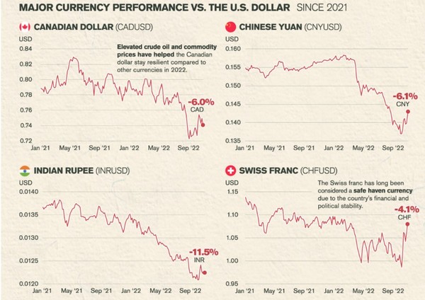 일본 엔화는 2021년 이래 25% 이상 하락하면서 가장 큰 타격을 입었다. 통화 하락을 방어하기 위해 일본정부가 428억 달러를 투입했다. 스위스 프랑과 캐나다 달러는 2021년 이후 미국 달러에 대해 견조한 흐름을 보였다. 튼튼한 재정과 안정적인 정치 상황이 배경이 됐다. 캐나다는 2022년 원유 가격 급등 수혜 효과를 톡톡히 누렸다. 자국산 원유의 대부분을 미국으로 수출했다.