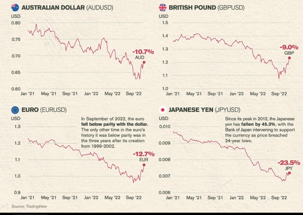 그림에서 보듯 지난 2년 동안 대부분의 주요국 통화가 미국 달러 대비 가치가 떨어졌다. 가장 큰 타격을 받은 통화 중 하나는 유로였다. 유로는 2022년 9월과 10월 일시적으로 패리티(유로가 1달러 미만의 가치가 있음을 의미) 아래로 미끄러지는 수모를 겪기도 했다. 11월 5.3% 상승하면서 다시 1달러대를 회복했다.