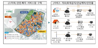 경남 산청군은 우리동네살리기 사업(‘18년 선정)으로 집수리 사업, 주차장 조성 및 가로정비 등을 통해 주거환경 개선을 위한 재생사업을 추진 중이다. 재생사업지 내 건축물 157동(전체 87%)에 화재감지 및 긴급출동 서비스, 독거노인 40호에 AI기반 안심케어 서비스 및 안전 스마트폴 서비스를 구축하여 사업지 전반에 촘촘한 안전·복지망을 강화할 예정이다.