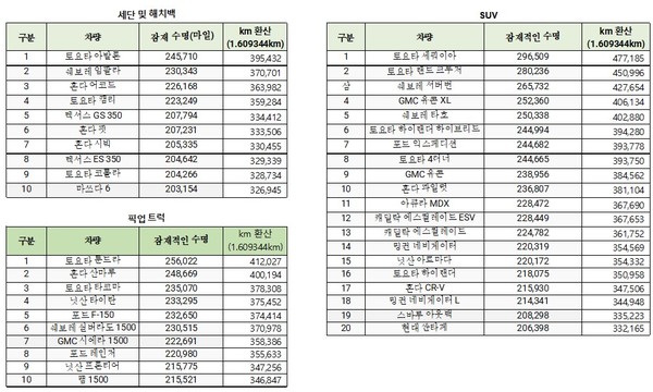 픽업트럭에서는 토요타 툰드라(41만km), 혼다 산마루(40만km) 등으로 조사됐다.