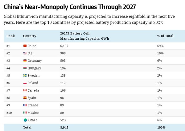 중국은 전 세계 제조 용량의 77%에 해당하는 900기가와트시에 가까운 배터리 생산시설을 갖추고 있다. 세계 10대 배터리 제조업체 중 6곳이 중국업체이다. 중국이 이처럼 배터리 시장에서 우위를 가지고 있는 배경에는 금속 채굴에서 전기차 생산에 이르기까지 이어진 전기차 공급망의 수직적 통합 영향이 크다. 중국은 지난 2021 기준 전세계 전기차 판매량의 52%를 차지할 정도로 전기차 보급이 활발하다.