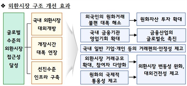 해외에 있는 금융기관도 국내 외환시장에 참여할 수 있게 되며, 외환시장 마감 시간은 현재의 오후 3시30분에서 새벽2시로 연장된다. 단계적으로 24시간 열려 있는 시장을 만들 계획이다.