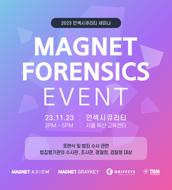 포렌식, 악성코드 및 침해사고 분석 대응 전문업체 인섹시큐리티는 디지털포렌식(범죄 증거 수집 및 분석) 솔루션 기업 '마그넷 포렌식'과 법집행기관의 수사관, 조사관, 경찰청, 검찰청 담당자들을 대상으로 이벤트 세미나를 개최한다고 30일 밝혔다.