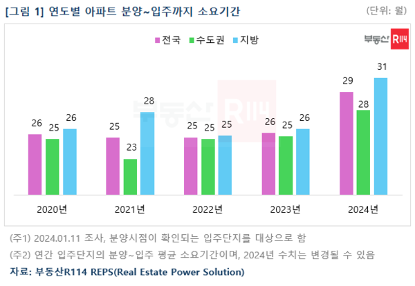 23일 부동산R114에 따르면 올해 아파트 분양부터 입주까지의 걸리는 기간은 평균 29개월이 소요되는 것으로 나타났다. 최근 4개년(2020년~2023년) 평균 공사기간 25개월 보다 4개월이 더 걸리는 셈이다.