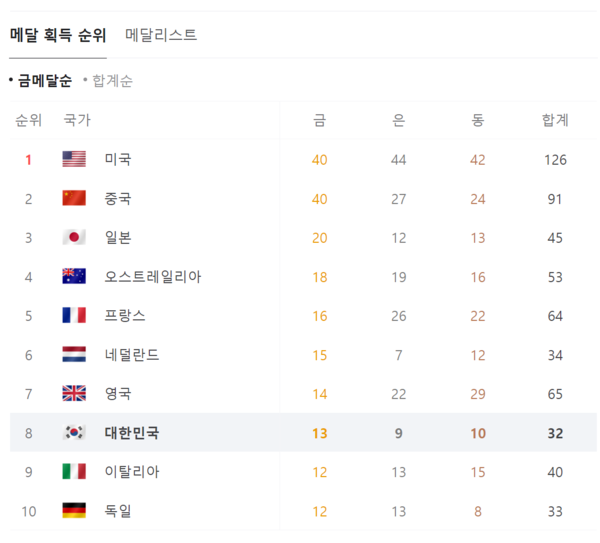 금메달 13개로 최다 금메달과 타이를 이루면서 종합 8위에 올랐다. 종합 1위는 마지막 날 중국을 간발의 차로 제친 미국이다. 중국은 2위, 일본은 3위에 올랐다.