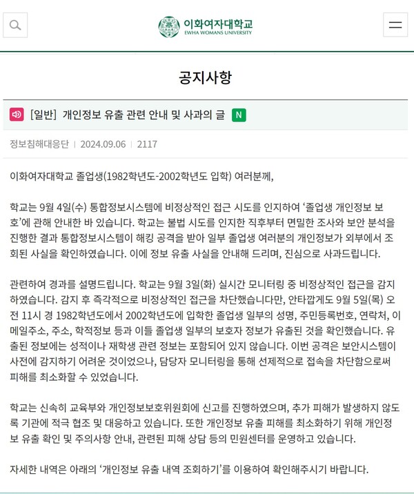 공지에 따르면 이대 학교 통합정보시스템이 해킹 공격을 받았고, 1982학년∼2002학년도에 입학한 졸업생 일부의 성명, 주민등록번호, 연락처, 이메일주소, 주소, 학적 정보 등이 유출됐다.