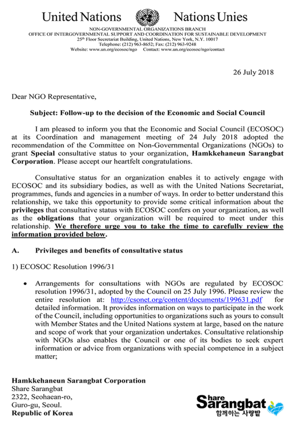 NGO단체 '함께하는 사랑밭'은 2018년 6월26일, 유엔 경제사회이사회로부터 특별 협의지위를 부여받았습니다. △국제 회의 및 행사 참여 △국제 행사에서 서면 및 구두 의견서 발표 △ 부대 행사 조직 △유엔 구역 출입 △네트워크 형성 및 활동에 참여하고 있습니다.