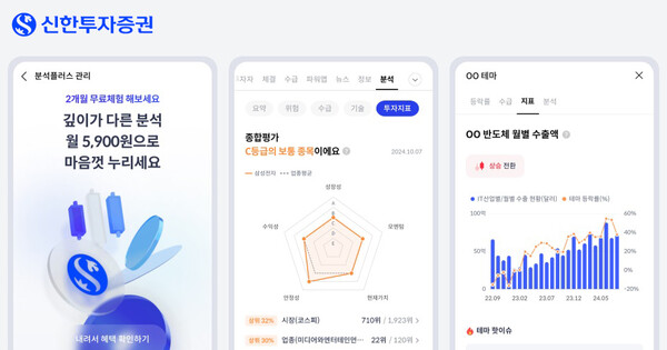 한편, 신한투자증권은 올해 4월 해외주식 정보를 추가해 제휴 서비스 영역을 확장한 ‘투자플러스’와 7월에 오픈한 ‘쉬운 공시’ 서비스에 이어 차별화된 프리미엄 투자 정보를 제공하는 ‘분석플러스’ 서비스로 디지털 자산관리를 제공한다. ‘분석플러스’ 서비스는 9월 30일 오픈 이후 가입 신청 고객이 약 5,000명에 달하고 있다.