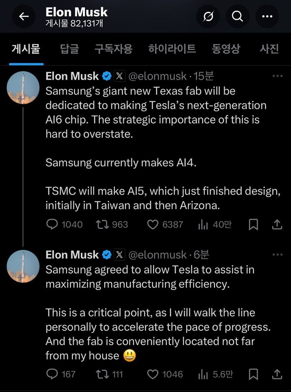 머스크는 "삼성의 거대한 텍사스 신규 팹(Fab)이 테슬라 차세대 AI6 칩 생산에 전념할 예정”이라며 “이것의 전략적 중요성은 아무리 강조해도 지나치지 않다”고 밝혔다.