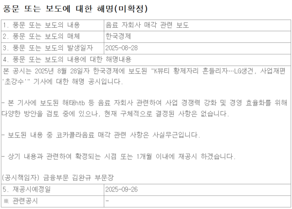 사업 재편을 위해 해태htb와 코카콜라음료 등의 음료 부문 매각을 진행하고 있다는 보도와 관련해서다.