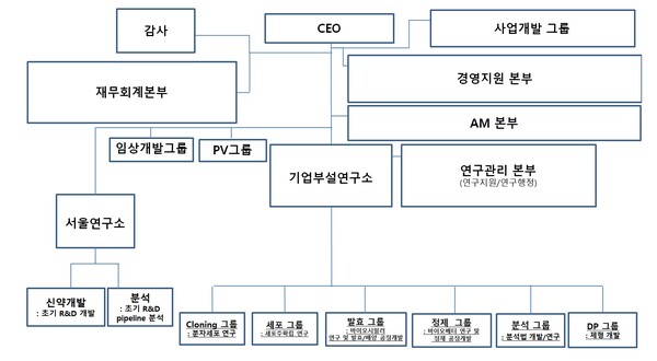 CEO 즉, 박순재 대표이사를 정점으로 사업개발그룹, 재무회계본부, 경영지원본부, AM본부, 임상개발그룹, PV그룹, 기업부설연구소, 서울연구소가 편재됐다.